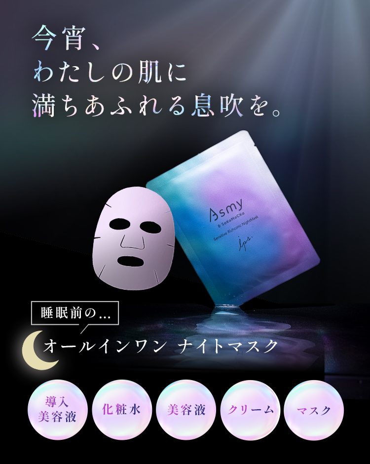 再生医療への応用が期待されるiPS細胞から生まれた、「iPS細胞培養上清液*2」配合の美容液をマスク1枚に約1本分 (30mL) 贅沢に含ませた、オールインワンナイトマスクです。 洗顔後の肌にのせるだけで、濃密なうるおいとハリを集中的に与え、翌朝はくすみ*3が晴れたような、なめらかで透明感*4 のある肌へ導きます。 *1 年齢に応じたお手入れ *2 ヒト(線維芽細胞/単核細胞)人工多能性細胞培養順化培養液(保湿成分) *3 乾燥による *4 肌がうるおい、キメがととのっていること