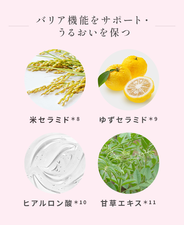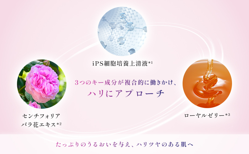 *1 ヒト(線維芽細胞/単核細胞)人工多能性細胞培養順化培養液(保湿成分) *2 整肌成分 *3 加水分解ローヤルゼリータンパク(整肌成分) *4 肌がうるおい、キメがととのっていること *5 角層まで *6 iPS細胞や不純物を取り除いた上澄み液(上清液) *7 年齢に応じたお手入れ *8 グルコシルセラミド(保湿成分) *9 ユズ果実エキス (整肌成分) *10 ヒアルロン酸Na(保湿成分) *11 グリチルリチン酸2K (整肌成分)