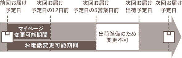 お届け日や時間、お支払い方法の変更が自由にできます。 インターネットの場合は、次回お届け日の12日前までに、マイページで変更可能です。 お電話での変更をご希望の場合は、次回お届け日の5営業日前までにお手続きください。 お届けなどの変更は、マイページもしくはお電話で受付しております。