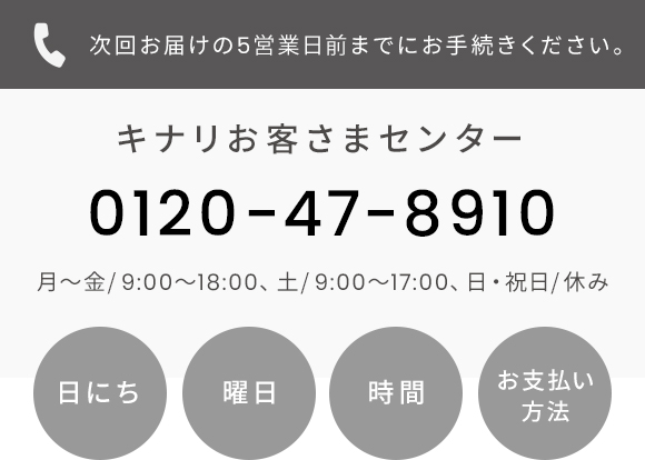 定期便に購入回数のお約束はございませんので安心して続けていただけます。 解約は1回目の商品受け取り後、お電話にて承ります。 次回お届けの5営業日前までにキナリお客さまセンター(0120-47-8910)にご連絡ください。