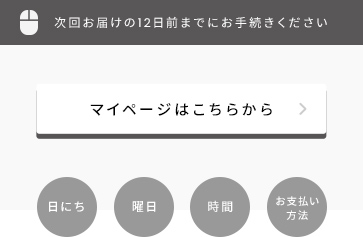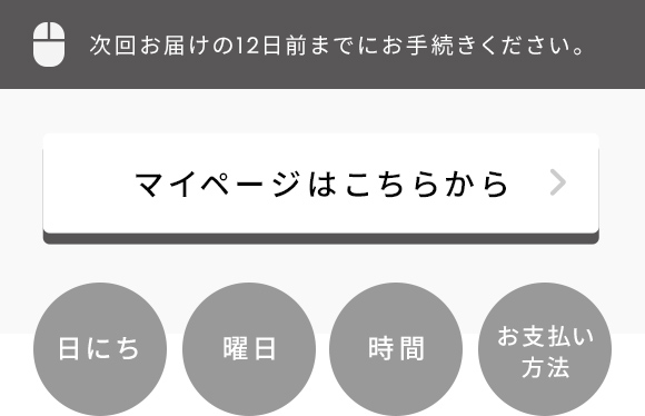 お届け内容やお届け予定日を、商品お届けの16日前にメールでお知らせします。 お届け日や1回休止などの変更は、インターネットの場合は、次回お届け日の12日前までに、マイページで変更可能です。 お電話での変更をご希望の場合は、次回お届け日の5営業日前までにお手続きください。