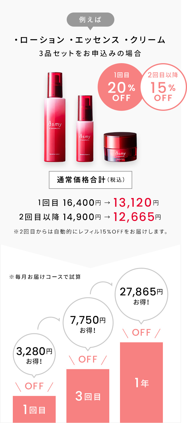 日頃よりアズミーをご愛顧いただき、誠にありがとうございます。 このたび、アズミーの【定期お届けおトク便】の価格を、2025年10月1日より改定(値下げ)いたします。 物価高騰が続くなか、お客さまから「もう少しお値段がお手頃だと嬉しい」「長く続けたい」というお声をいただいておりました。 そこで、お客さまに「より長く、安心して、すこやかな肌を育んでいただきたい」という想いで、生産から資材、物流等のコストを見直し、今回の値下げをお知らせできることになりました。 今後も、皆さまにご満足いただける商品と、 より良いサービスを提供できるよう、一層の努力を続けてまいります。 引き続き、アズミーをご愛顧いただけますよう、心よりお願い申し上げます。 価格改定日:2025年10月1日(水)9:00以降のご注文分より ※ご契約中の定期便は、2025年10月13日(月)以降のお届け分から新価格でお届けいたします。 詳細はこちらをご覧ください >