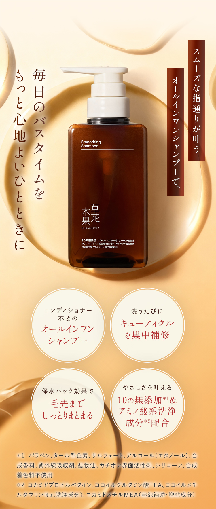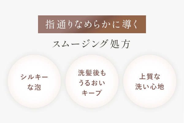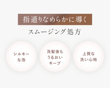 洗浄と補修のバランスを追求した「スムージング処方」で、髪や地肌の汚れを洗いながら髪のうるおいを守り、洗浄後も髪のなめらかさをキープ。キメ細かくシルキーな泡が髪を包み込み、きしみを抑えて指通りよく洗い上げます。