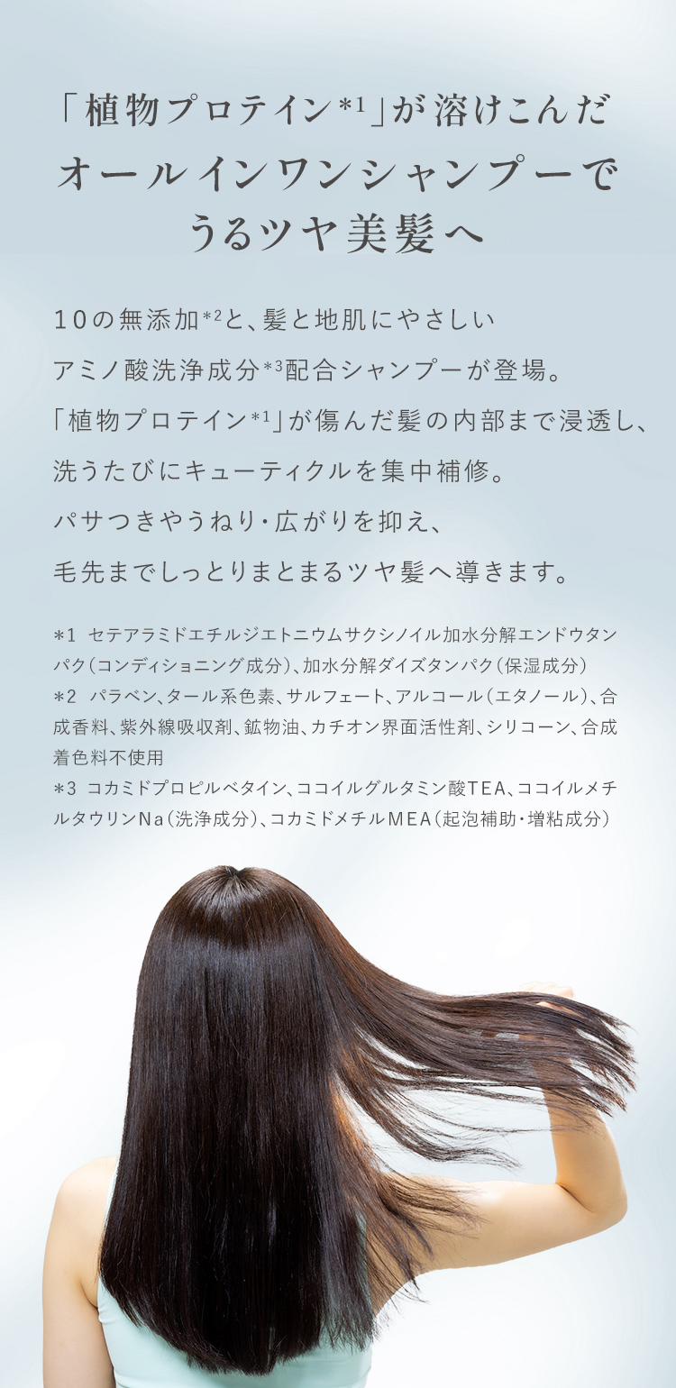 髪の主成分であるタンパク質に着目。 エンドウ豆や大豆由来の「植物プロテイン*」が、ダメージ部分に磁石のように吸着し、髪の内部まで浸透・集中補修。 洗うたびにキューティクルをととのえて、うねりや広がりを抑え、指通りの良いしなやかな美髪へ。