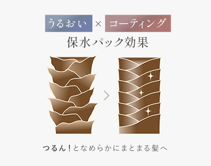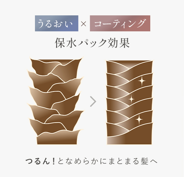 髪をなめらかにととのえる「シルク*1」や「シロキクラゲ多糖体*2」、 「植物性ラノリン*3」を配合。保水パック効果で、 髪にうるおいを与えながら、毛髪表面をコーティングし、つるんとなめらかにまとまる髪へ導きます。