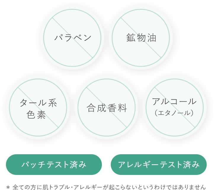 毎日、心地よく使ってほしいから、 すべての商品で肌にやさしい使い心地を追求し、ひとつひとつの原料を厳選。 パッチテストやアレルギーテスト、保存効力試験を行い、安全性を確認しています。