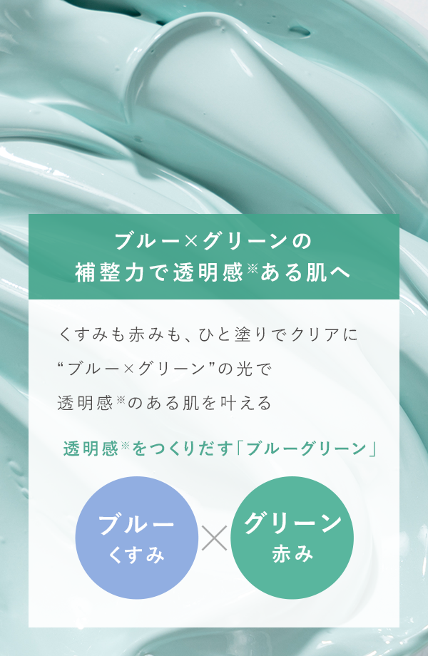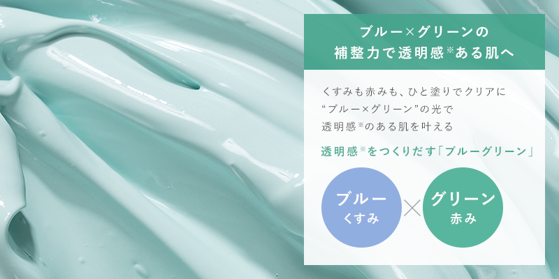 素肌に透明感をつくり出すブルーと、 くすみなどの色ムラをカバーするグリーンを合わせた ブルーグリーンのカラーコントロール。