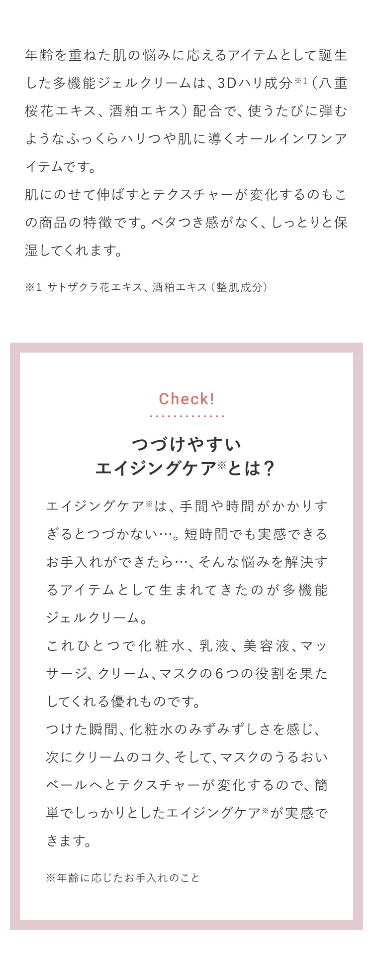 年齢を重ねた肌の悩みに応えるアイテムとして誕生した多機能ジェルクリームは、3Dハリ成分※1(八重桜花エキス、酒粕エキス)配合で、使うたびに弾むようなふっくらハリつや肌に導くオールインワンアイテムです。 肌にのせて伸ばすとテクスチャーが変化するのもこの商品の特徴です。ベタつき感がなく、しっとりと保湿してくれます。