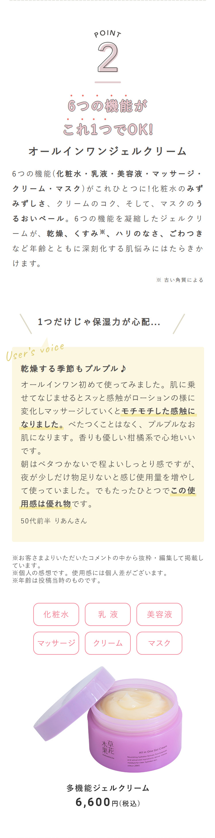 いつも『草花木果』商品をご愛用いただき、誠にありがとうございます。 このたび、日頃のご愛顧に感謝して「多機能ジェルクリーム ラージサイズ」を新発売いたします。