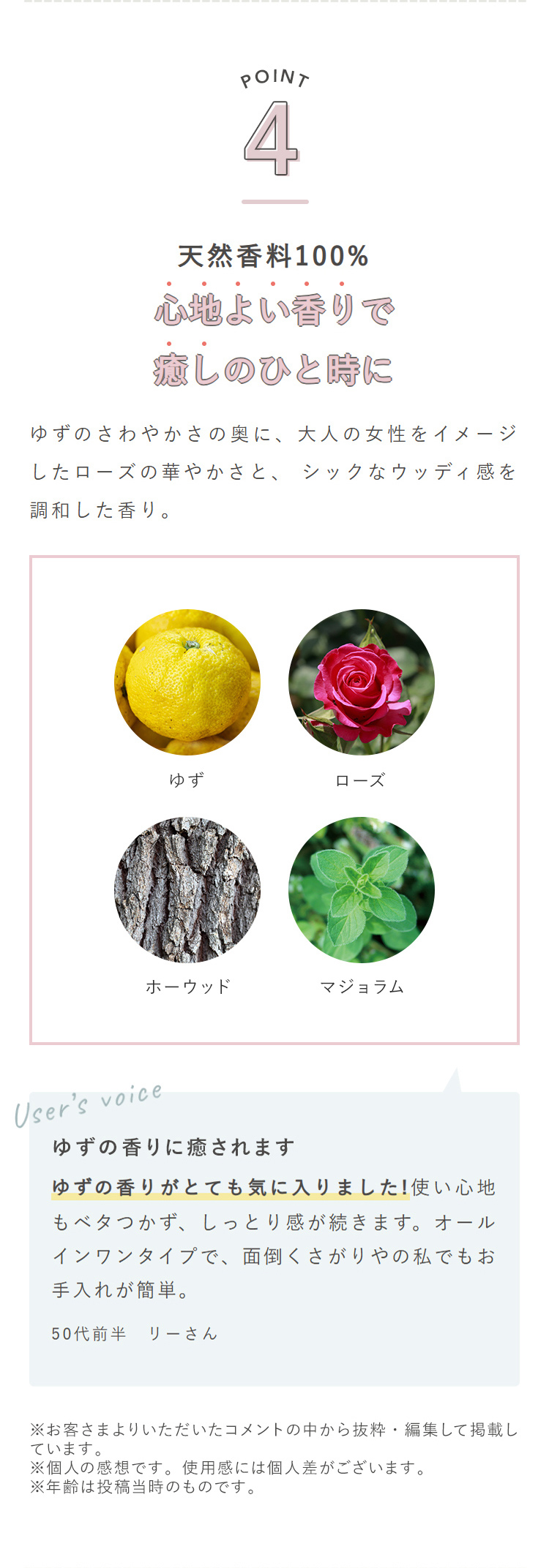 ゆずの香りがとても気に入りました!使い心地もベタつかず、しっとり感が続きます。オールインワンタイプで、面倒くさがりやの私でもお手入れが簡単。