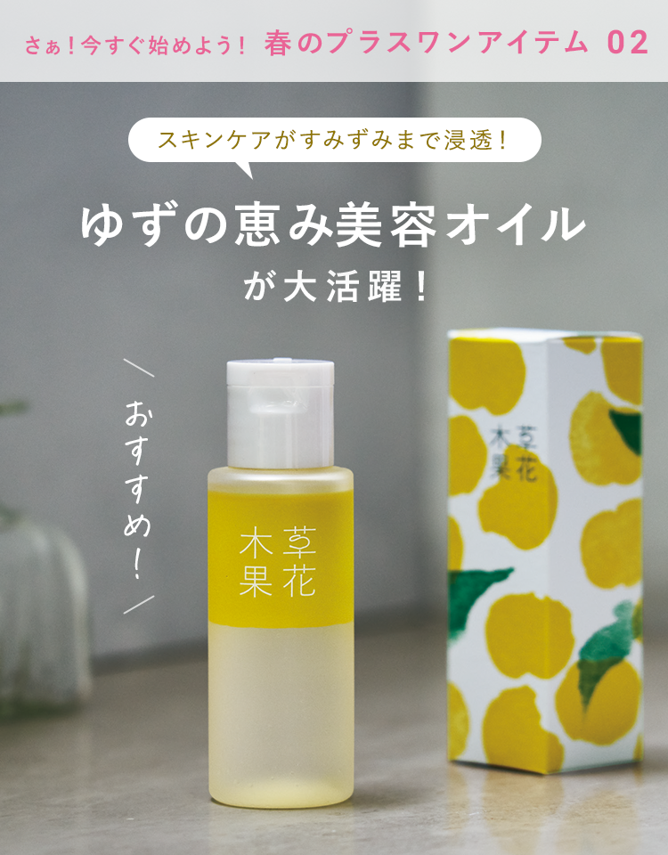 この時期は、気温差や花粉、乾燥した空気などの影響で、お肌がゆらぎやすくなりがちです。 表面はしっとりしているように見えても、実は水分が不足している“隠れ乾燥”状態のことも。 〈ゆずの恵み美容オイル〉は、ブースター効果のある美容オイルです。 洗顔後すぐつけると、次につけるスキンケアがすみずみまで浸透し、お肌がいつもよりもしっとりやわらかく! さらっと軽い使い心地なので、気持ちよくお使いいただけます。