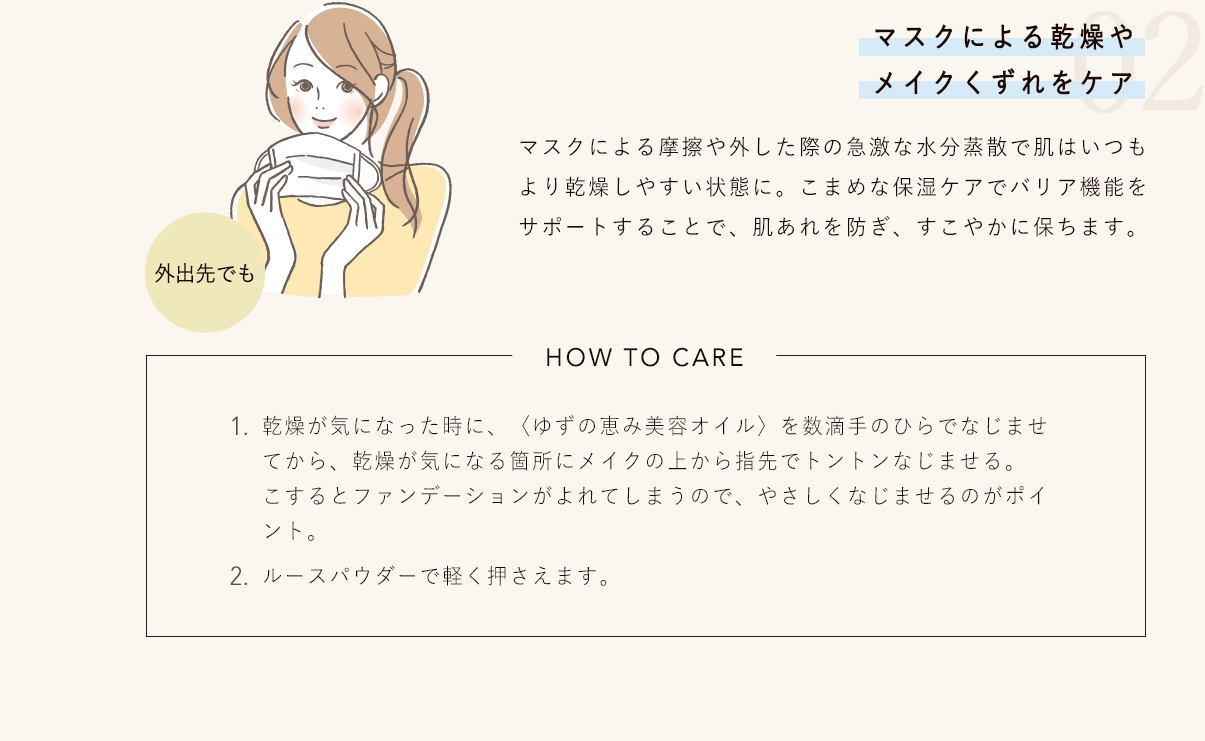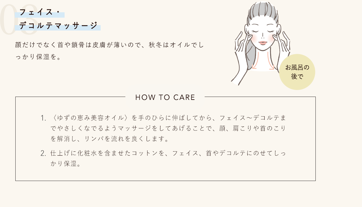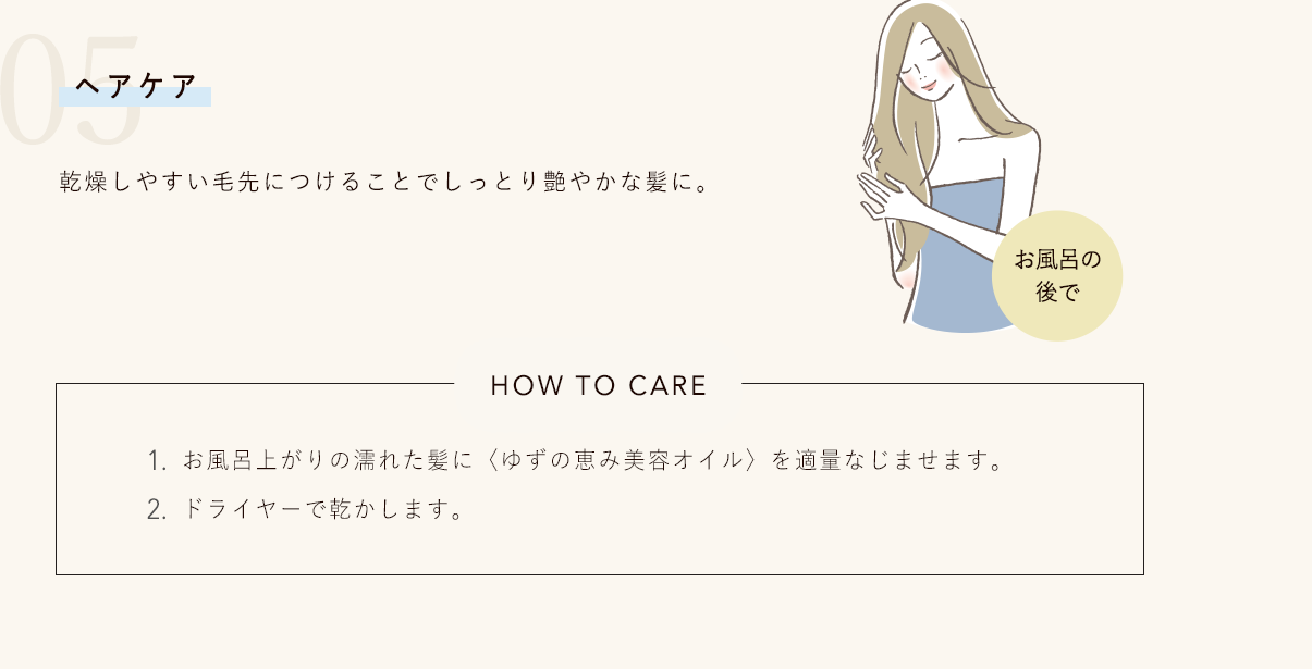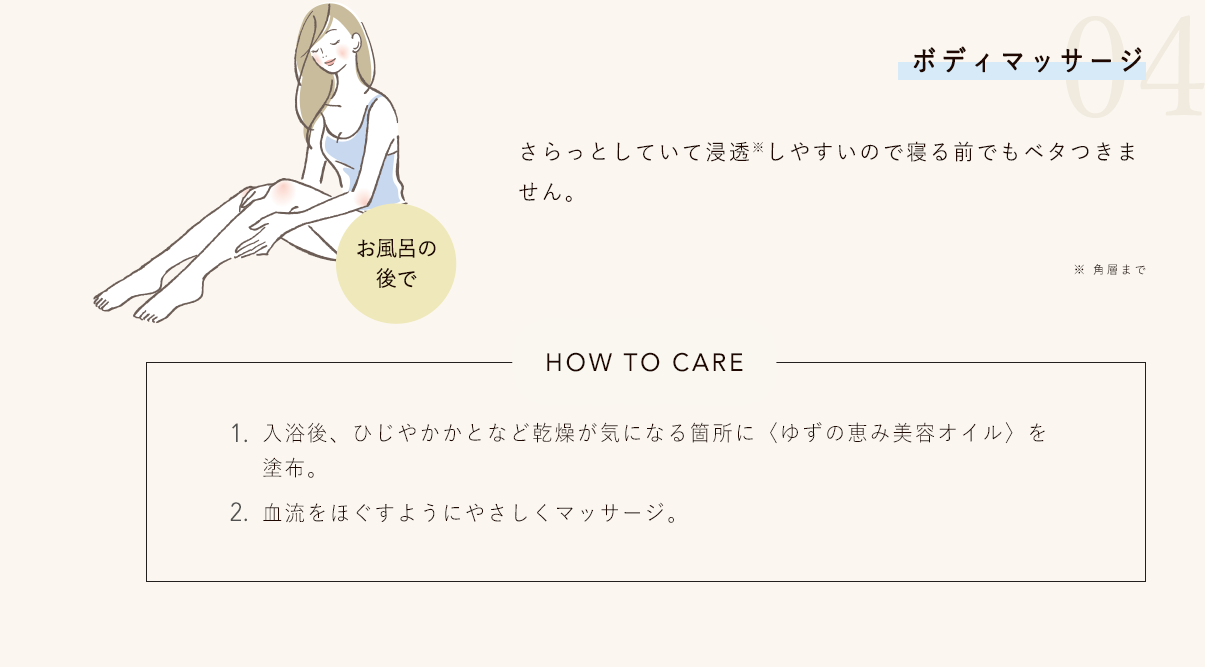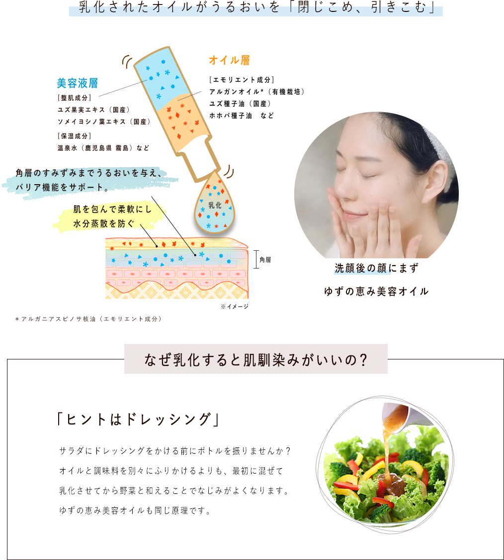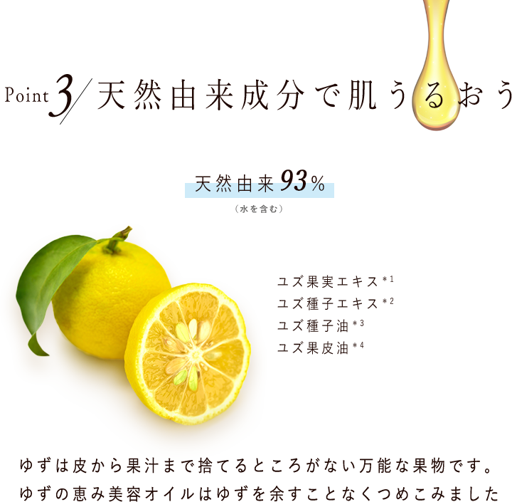 美肌の湯で知られる鹿児島県「関平温泉水※1」や「和潤環エキス※2」など、自然由来のうるおい成分を贅沢に配合。バターのようにとろける極上テクスチャーで、乾いた肌のすみずみまでうるおいで包み込み、肌本来のバリア機能をサポート。乾燥や肌あれを防いでなめらかな肌へ。高知県産オーガニックゆず100%の香りで、顔以外にも、全身マルチにお使いいただけます。 どうぞご期待ください。