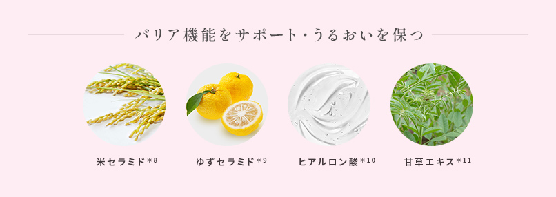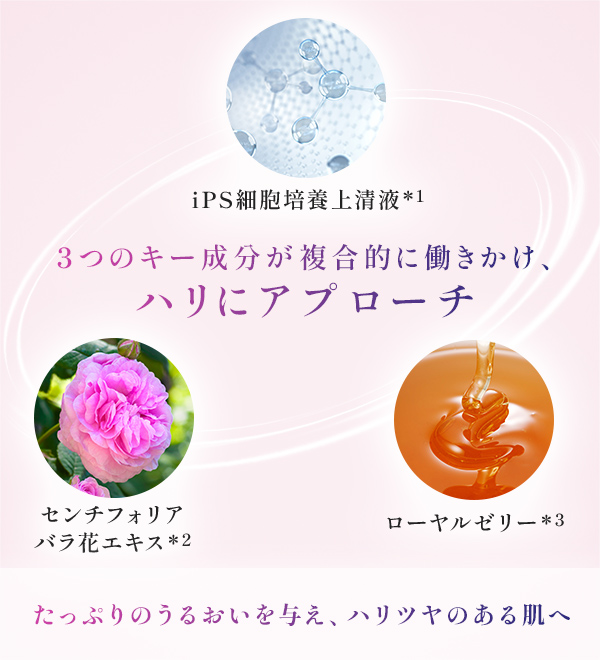*1 ヒト(線維芽細胞/単核細胞)人工多能性細胞培養順化培養液(保湿成分) *2 整肌成分 *3 加水分解ローヤルゼリータンパク(整肌成分) *4 肌がうるおい、キメがととのっていること *5 角層まで *6 iPS細胞や不純物を取り除いた上澄み液(上清液) *7 年齢に応じたお手入れ *8 グルコシルセラミド(保湿成分) *9 ユズ果実エキス (整肌成分) *10 ヒアルロン酸Na(保湿成分) *11 グリチルリチン酸2K (整肌成分)