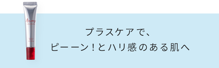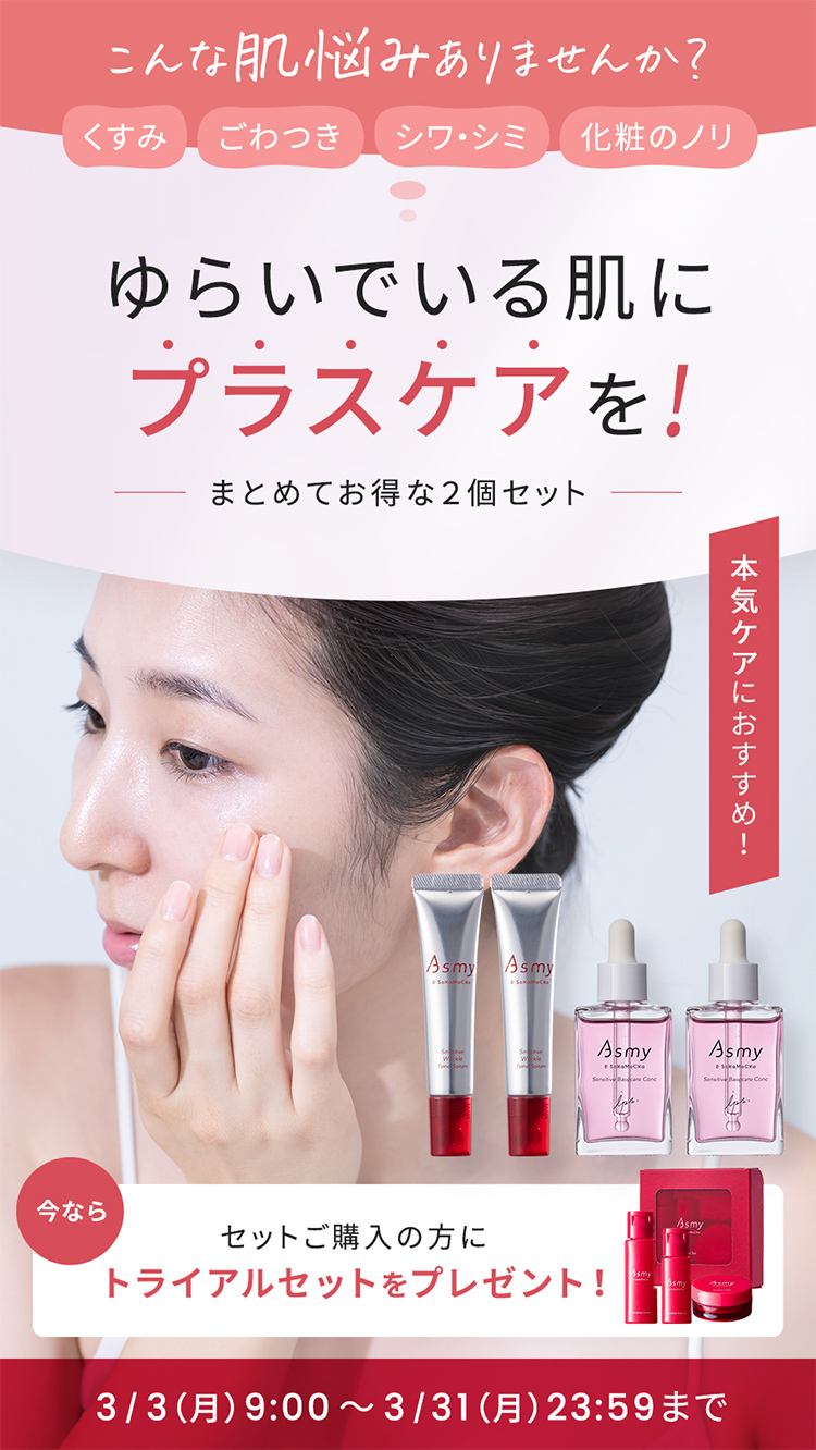 「季節の変わり目だから?」「花粉が飛んでいるから?」 なんだか、最近ゆらぎを感じる肌にプラスケアを! Asmyでは、いつものお手入れに追加して敏感になっている肌をケアするスペシャルアイテムをご用意しています。 洗顔後とお手入れの最後に取り入れることで、シワ、シミ、ごわつき、化粧のノリ、くすみなどに手ごたえを感じる美容液。 今なら、セットのご購入で、Asmyトライアルセットをプレゼント!