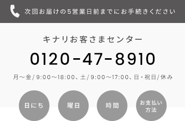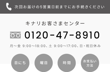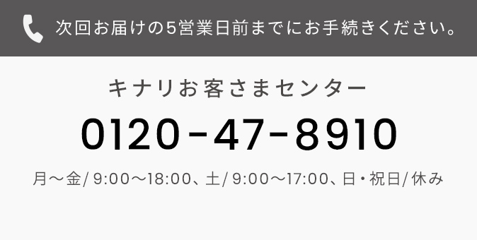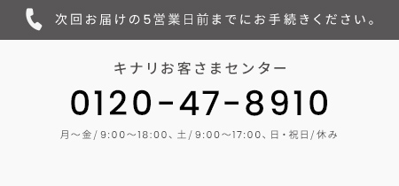 定期便に購入回数のお約束はございませんので安心して続けていただけます。 解約は1回目の商品受け取り後、お電話にて承ります。 次回お届けの5営業日前までにキナリお客さまセンター(0120-47-8910)にご連絡ください。