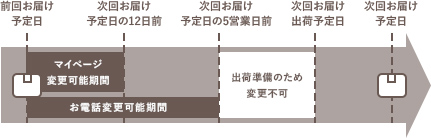 お届け日や時間、お支払い方法の変更が自由にできます。 インターネットの場合は、次回お届け日の12日前までに、マイページで変更可能です。 お電話での変更をご希望の場合は、次回お届け日の5営業日前までにお手続きください。 お届けなどの変更は、マイページもしくはお電話で受付しております。