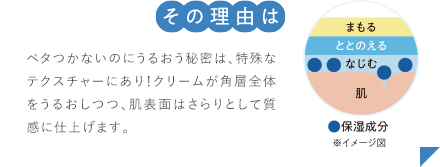 肌になじませるとスーッと伸びて、すぐにしっとり。 たっぷりの有用成分がすぐに浸透※1するから、肌表面はベタつかず、内側※2はしっかりとうるおいで満たされます。ミルキーで心地よい保湿クリームです。