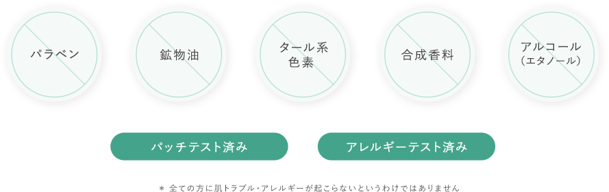 毎日、心地よく使ってほしいから、 すべての商品で肌にやさしい使い心地を追求し、ひとつひとつの原料を厳選。 パッチテストやアレルギーテスト、保存効力試験を行い、安全性を確認しています。