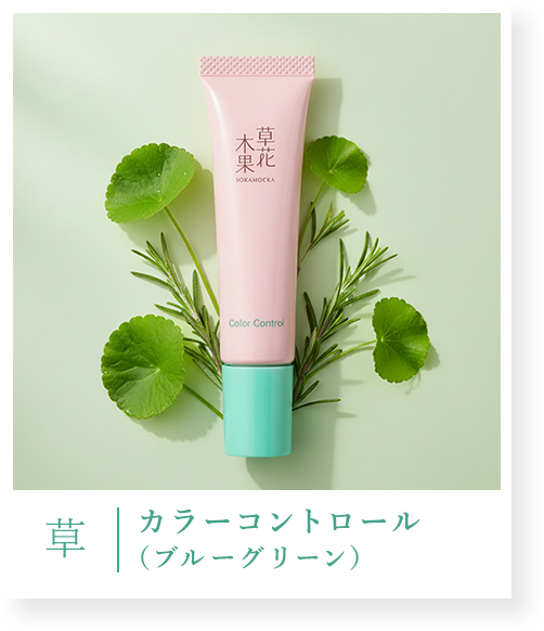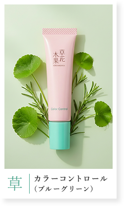 植物とともに歩んできた「草花木果」から、【草】【花】【木】【果】の 4つのスペシャルアイテムが限定発売品で登場します。 第1弾の【草】は、ブルーグリーン色の「カラーコントロール」。 瞬時に透明感をつくりだして、肌色の印象を変えるメイクアップベースをお届けします。