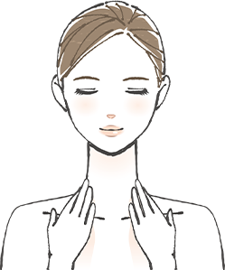 首の付け根から鎖骨のくぼんでいるところまで指の腹をつかって上から下へリンパを流すようにさすります。3回繰り返します。 深呼吸しながら、あまり力を入れずに、やさしくさする程度がおすすめです。