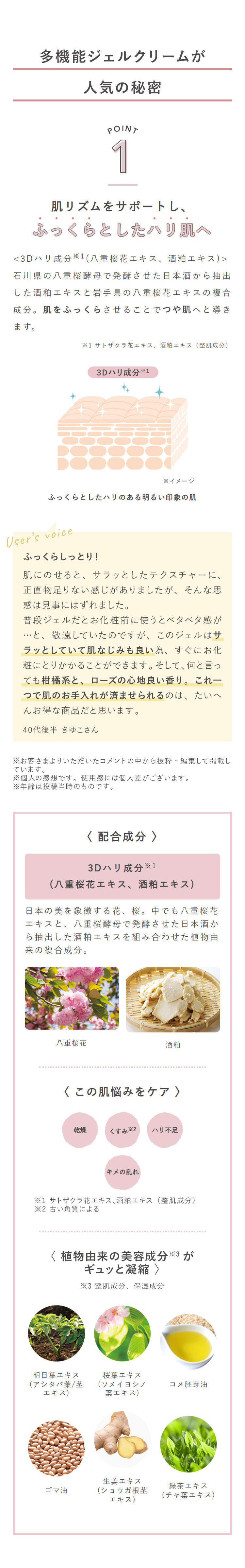 年齢を重ねた肌の悩みに応えるアイテムとして誕生した多機能ジェルクリームは、3Dハリ成分※1(八重桜花エキス、酒粕エキス)配合で、使うたびに弾むようなふっくらハリつや肌に導くオールインワンアイテムです。 肌にのせて伸ばすとテクスチャーが変化するのもこの商品の特徴です。ベタつき感がなく、しっとりと保湿してくれます。