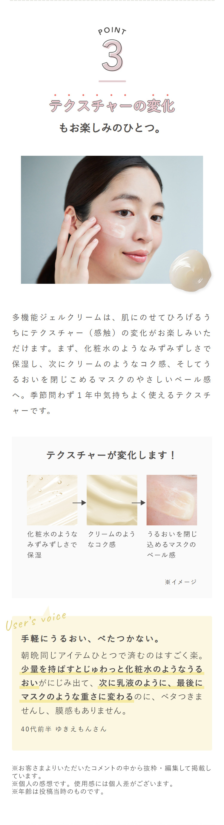多機能ジェルクリームは、肌にのせてひろげるうちにテクスチャー(感触)の変化がお楽しみいただけます。まず、化粧水のようなみずみずしさで保湿し、次にクリームのようなコク感、そしてうるおいを閉じこめるマスクのやさしいベール感へ。季節問わず1年中気持ちよく使えるテクスチャーです。