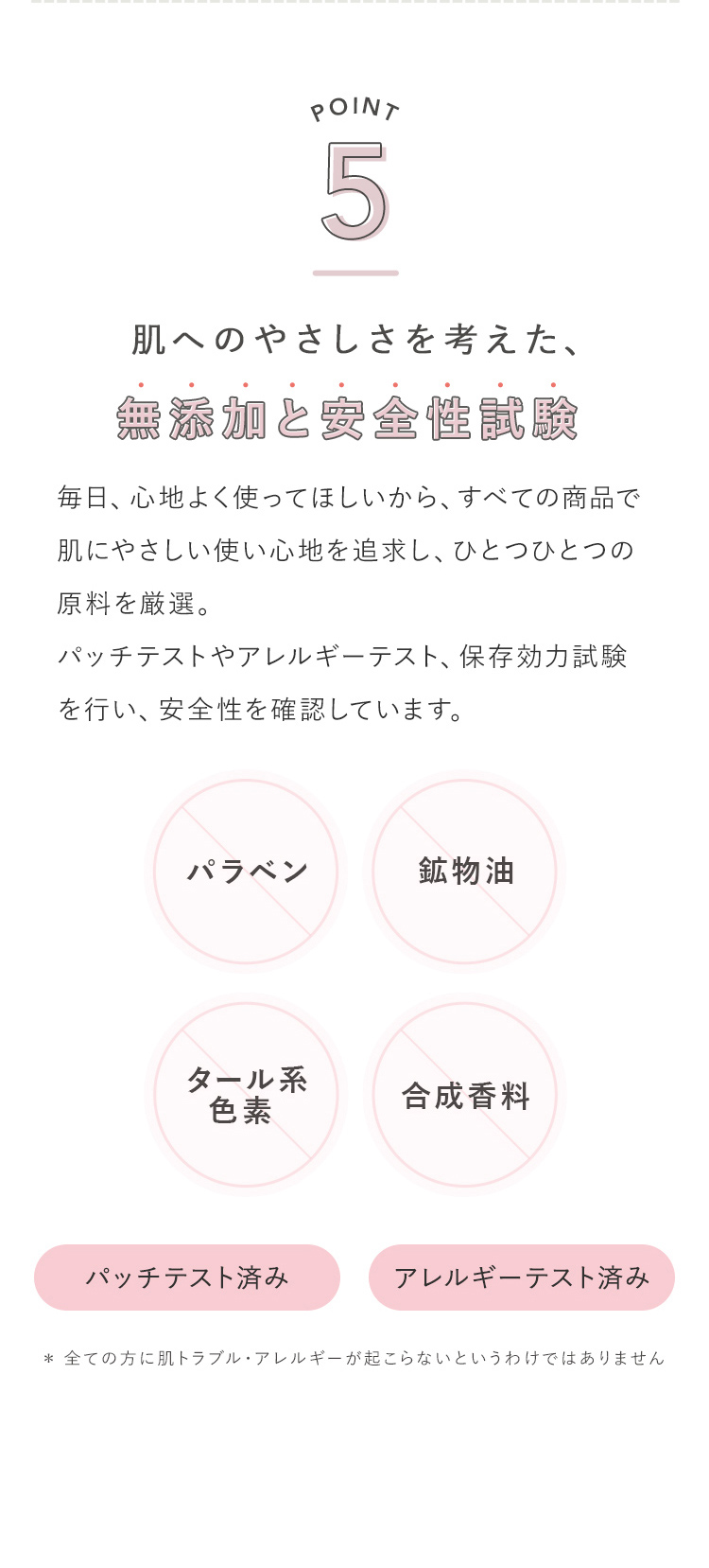 毎日、心地よく使ってほしいから、すべての商品で肌にやさしい使い心地を追求し、ひとつひとつの原料を厳選。 パッチテストやアレルギーテスト、保存効力試験を行い、安全性を確認しています。