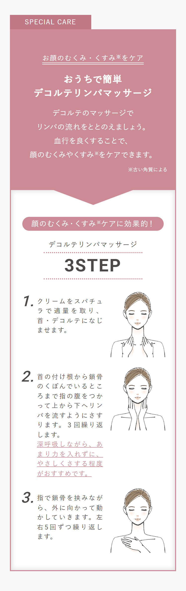 デコルテのマッサージでリンパの流れをととのえましょう。 血行を良くすることで、顔のむくみやくすみ※をケアできます。