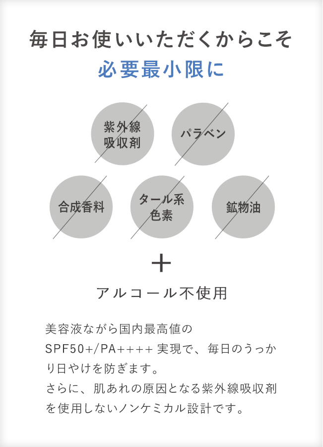 ノンケミカル設計で肌へのやさしさを追求しながら、国内最高値の紫外線カット効果を実現しました。 白浮きなく肌にすばやくなじむ、さらりとした軽い使い心地で塗布後はほんのりトーンアップ*2した仕上がり。化粧下地としても使える手放せない1本。