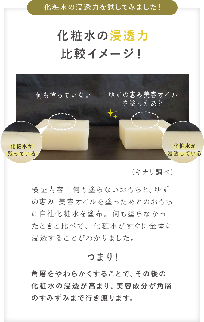 この時期は、気温差や花粉、乾燥した空気などの影響で、お肌がゆらぎやすくなりがちです。 表面はしっとりしているように見えても、実は水分が不足している“隠れ乾燥”状態のことも。 〈ゆずの恵み美容オイル〉は、ブースター効果のある美容オイルです。 洗顔後すぐつけると、次につけるスキンケアがすみずみまで浸透し、お肌がいつもよりもしっとりやわらかく! さらっと軽い使い心地なので、気持ちよくお使いいただけます。