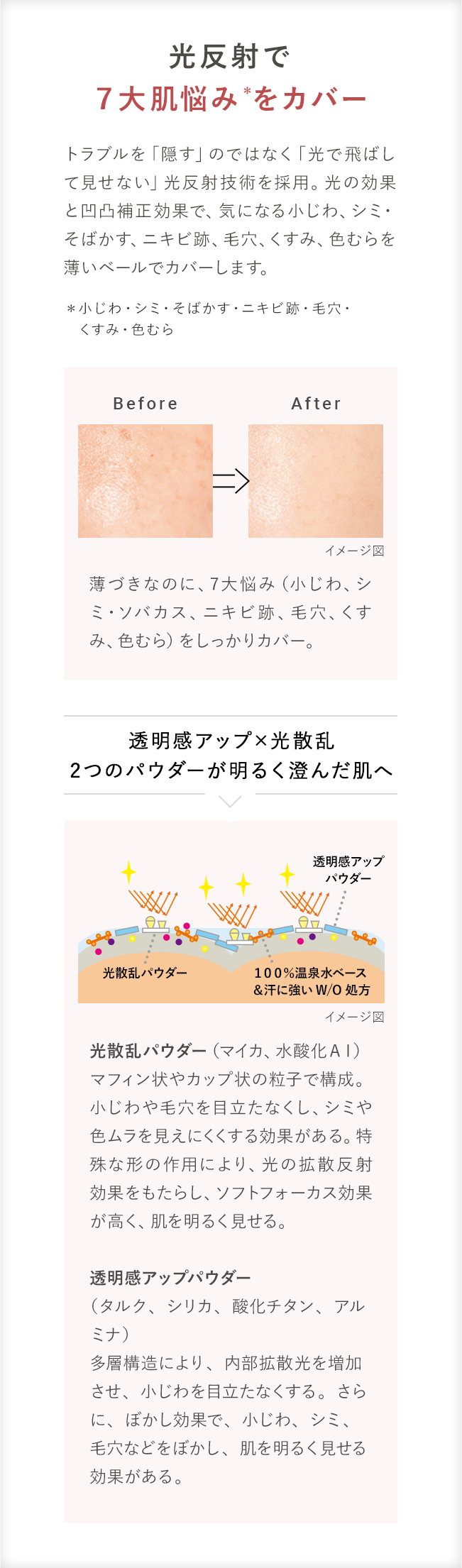 <全成分表示> 温泉水、シクロペンタシロキサン、酸化チタン、酸化亜鉛、イソステアリン酸エチル、ジフェニルシロキシフェニルトリメチコン、プロパンジオール、メタクリル酸メチルクロスポリマー、カプリリルメチコン、エタノール、イソステアリン酸ポリグリセリル-2、ジメチコン、PEG/PPG-19/19ジメチコン、ベニバナ赤、サトザクラ花エキス、酒粕エキス、ユズ果実エキス、ビルベリー葉エキス、シルク、ジステアルジモニウムヘクトライト、塩化Na、シリカ、(ジメチコン/ビニルジメチコン)クロスポリマー、ステアリン酸亜鉛、水酸化Al、含水シリカ、ヤシ油脂肪酸BG、マイカ、イソステアリン酸、硫酸Mg、結晶セルロース、アルミナ、水、銀、BG、トコフェロール、香料、酸化鉄、タルク、ハイドロゲンジメチコン、メチコン