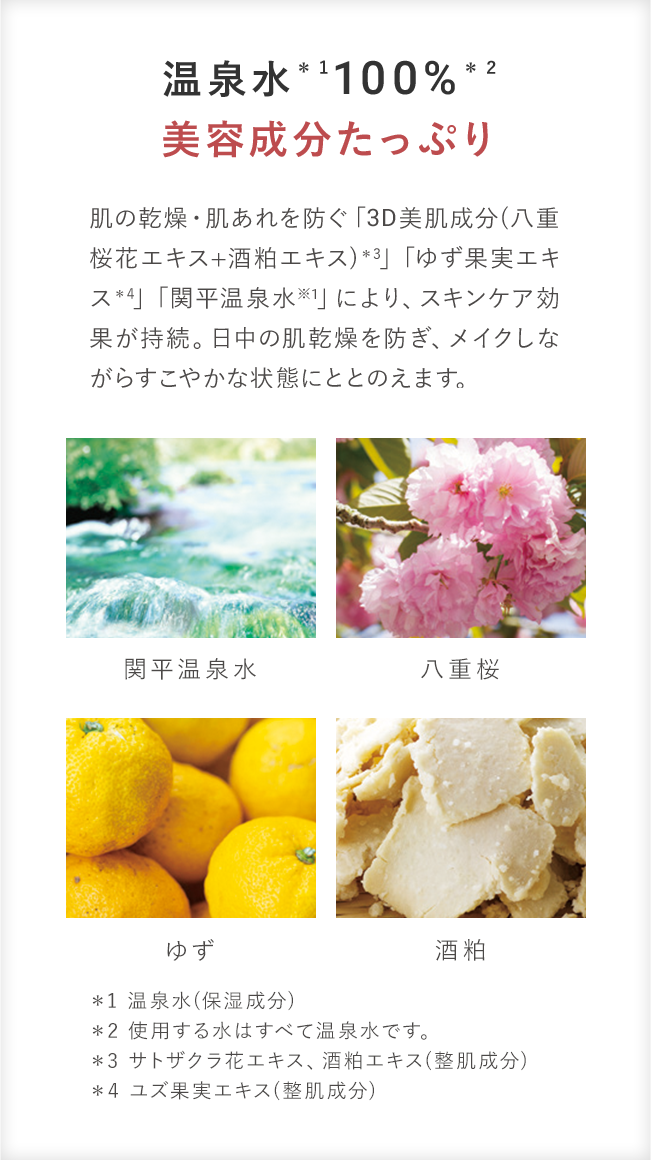 <全成分表示> 水、トリエチルヘキサノイン、BG、ホホバ種子油、グリセリン、アルガニアスピノサ核油、シア脂、スクワラン、ユズ種子油、ユズ種子エキス、ユズ果実エキス、コメ胚芽油、ソメイヨシノ葉エキス、温泉水、セラミドNG、セラミドAP、セラミドAG、セラミドNP、セラミドEOP、ラベンダー花エキス、ダマスクバラ花エキス、ローズマリー葉エキス、クダモノトケイソウ種子油、ショウガ根油、テトラヒドロピペリン、カニナバラ果実エキス、セイヨウノコギリソウエキス、セイヨウサンザシ果実エキス、セージ葉エキス、ヘリクリスムイタリクムエキス、水添レシチン、フィトステロールズ、PCA-Na、エタノール、塩化Na、安息香酸Na、フェノキシエタノール、ヒドロキシプロピルメチルセルロース、ベンザルコニウムクロリド、トコフェロール、クエン酸Na、クエン酸、ミリスチン酸ポリグリセリル-10、パルミチン酸アスコルビル、香料