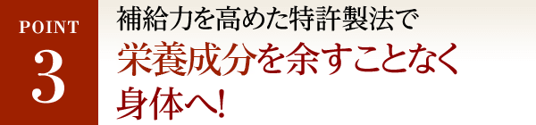 ミラクルクイーンは一般的なローヤルゼリーに比べ、特許製法(特許第5199508号「易崩壊性ローヤルゼリー含有錠剤およびその製造方法」)による補給力の高さが自慢です。飲用後に溶けやすく補給力の高いローヤルゼリーの開発に成功。新鮮なローヤルゼリーの栄養成分を無駄なく身体へ届けます。