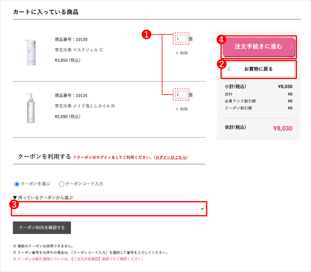 3クーポンは、下記の方法でご利用いただけます。 ・入力欄にクーポン番号を入力してください。 ・「お誕生月プレゼント」など現在お持ちのクーポンは、ログイン後に利用されたいクーポンをプルダウンで選択してください。